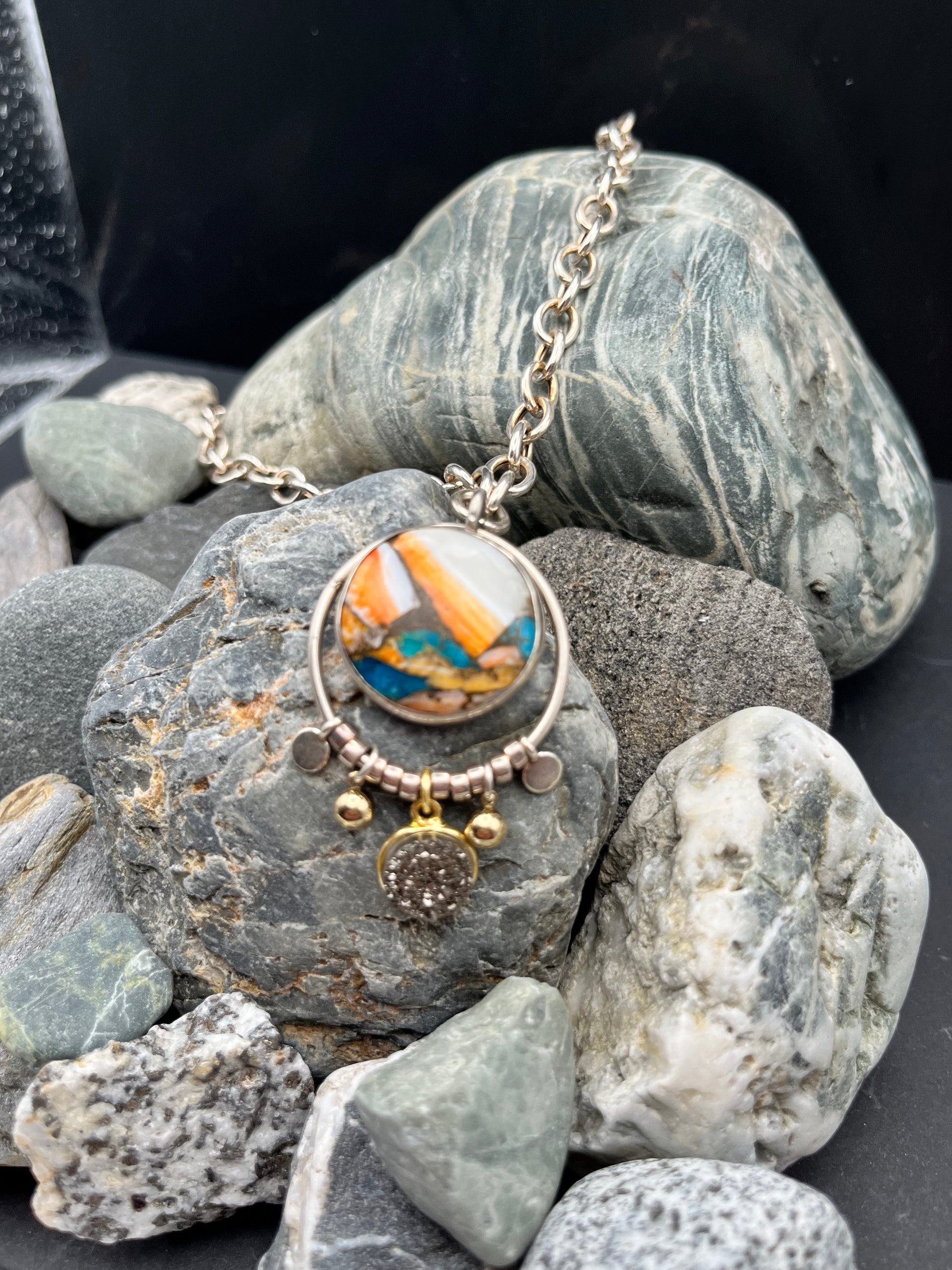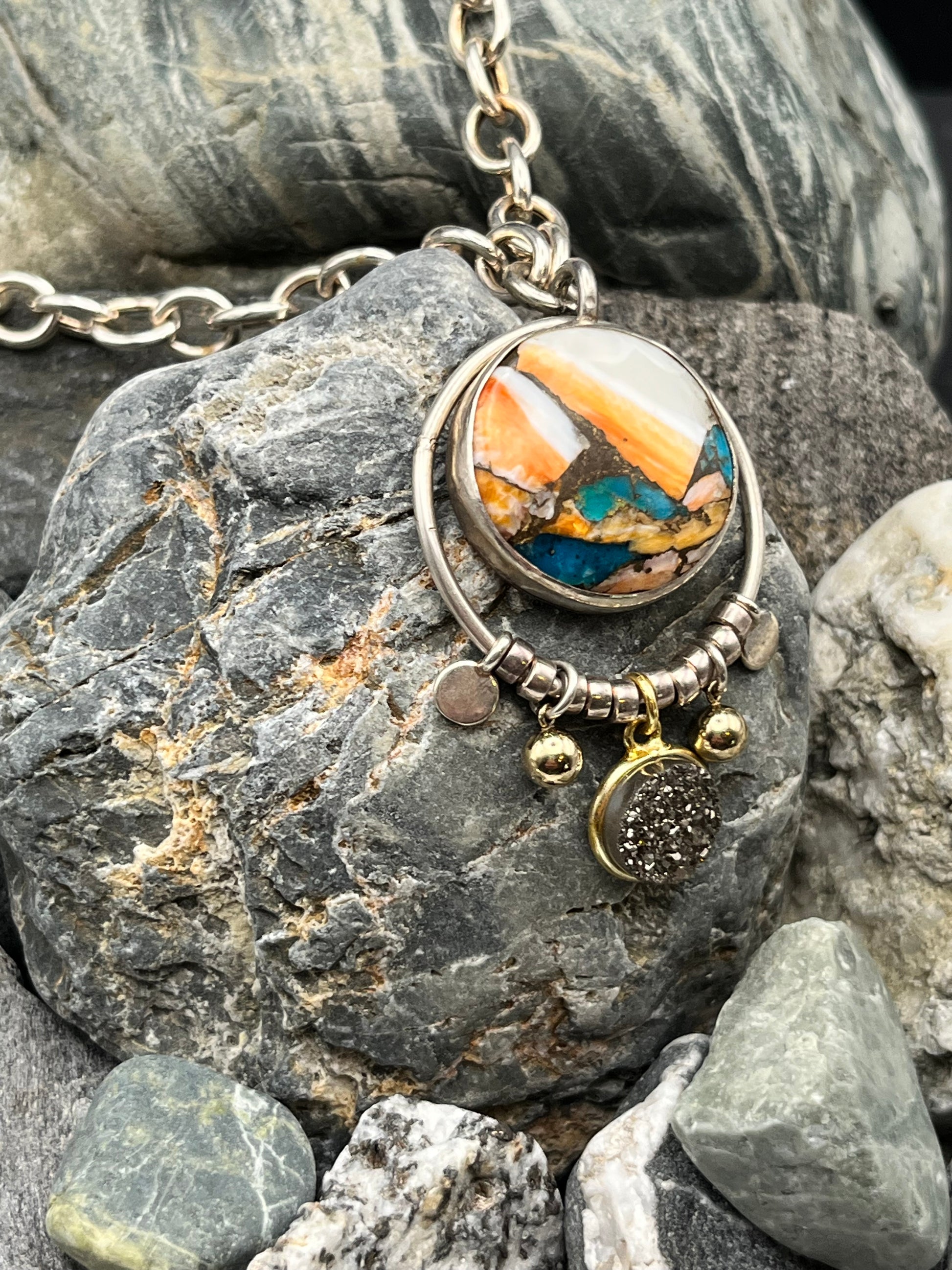 An elegant celestial composition in sterling silver. A striking spiny oyster and Kingman turquoise sphere serves as the planetary focal point, complemented by a carefully arranged constellation of silver satellites in varied geometric forms and a luminous druzy moon. Refined craftsmanship meets cosmic inspiration. Comes with sterling silver chain.