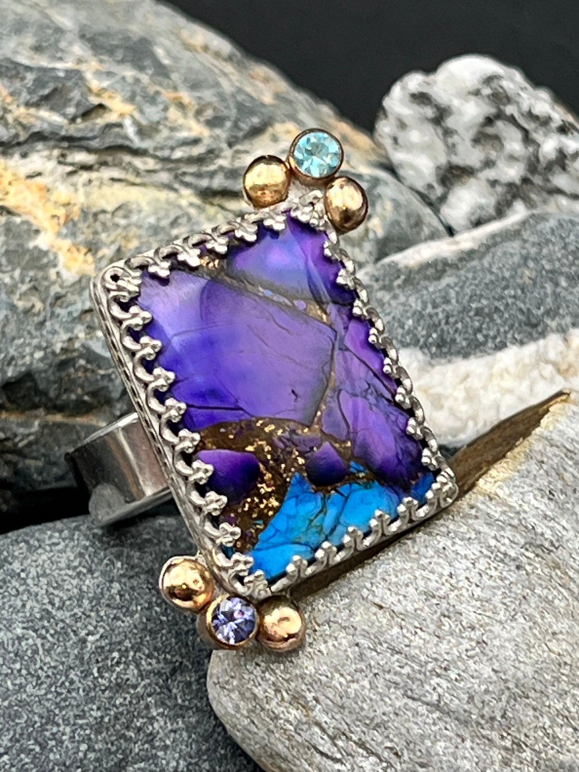 Crafted in sterling silver with a refined gallery bezel, this striking ring showcases a vibrant Mojave Purple turquoise centerpiece at size 8. Artfully detailed with gold alloy accents at opposing corners, each featuring a luminous 3 mm blue topaz or amethyst stone, the design balances bold color with understated elegance. Mojave Purple turquoise—a natural Kingman variety enhanced through careful dyeing and infused with copper and bronze—delivers the rich, saturated hue that defines this collection's signature aesthetic.